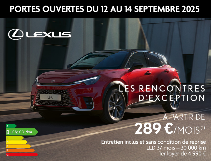 participant, en *Location Longue Durée, entretien inclus, de 37 mois & 30 000 km (au 1er des 2 termes atteint). 1er loyer majoré de 4 990 €**, suivi de 36 loyers de 289 €. **Frais de dossier de 150 € inclus dans la première échéance. Modèle présenté : Lexus LBX 2WD Cool avec option peinture métallisée neuf à 410 €/mois. 1er loyer majoré 4 990 € aux mêmes conditions. Frais de dossier inclus. Sous réserve d’acceptation par Toyota France Financement - RCS 412 653 180 - ORIAS n°D-P3GY-MUFY9-27 consultable sur www.orias.fr. Voir Lexus.fr.